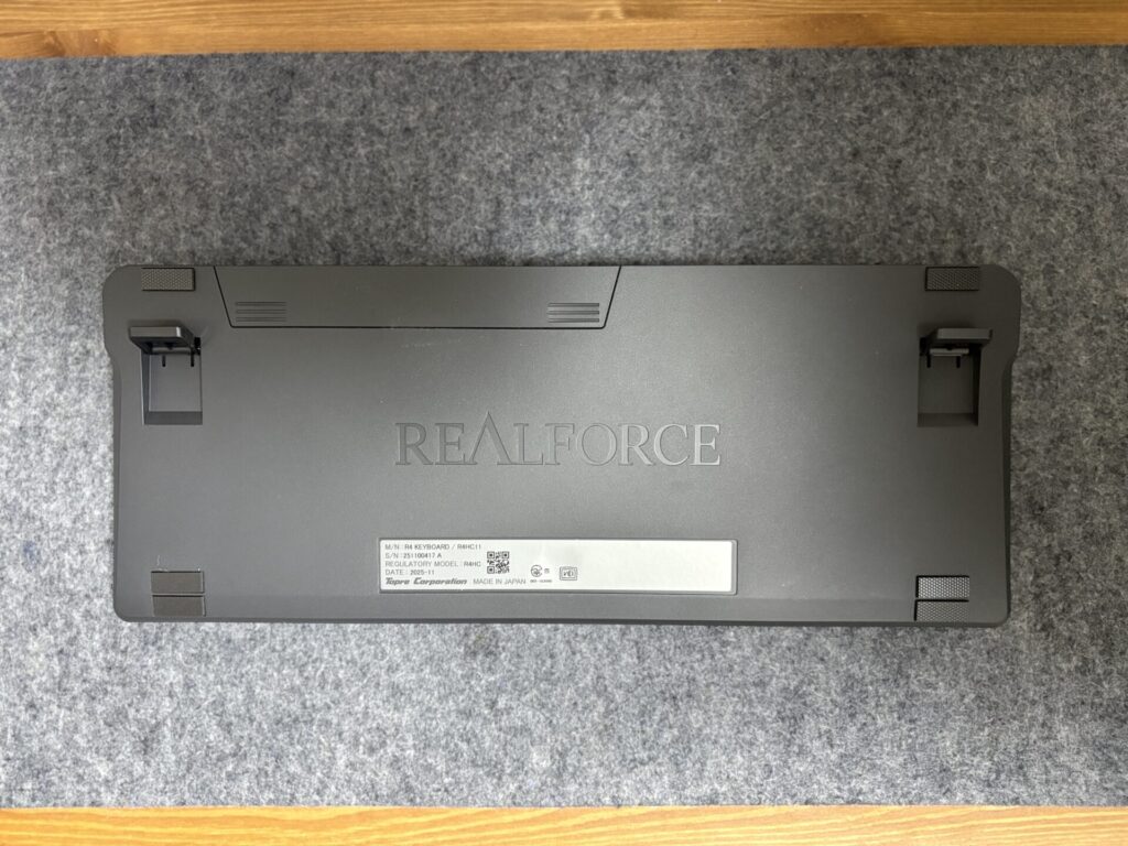 REALFORCEって裏面の中央にシールが貼られているのが多かったですが、REALFORCE R4はロゴが印字されていて、下にシールが貼られていました。個人的にこのデザインの方が好きです!